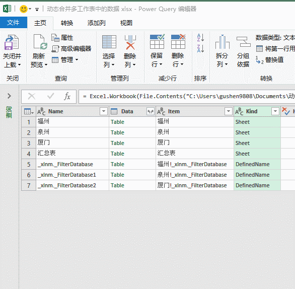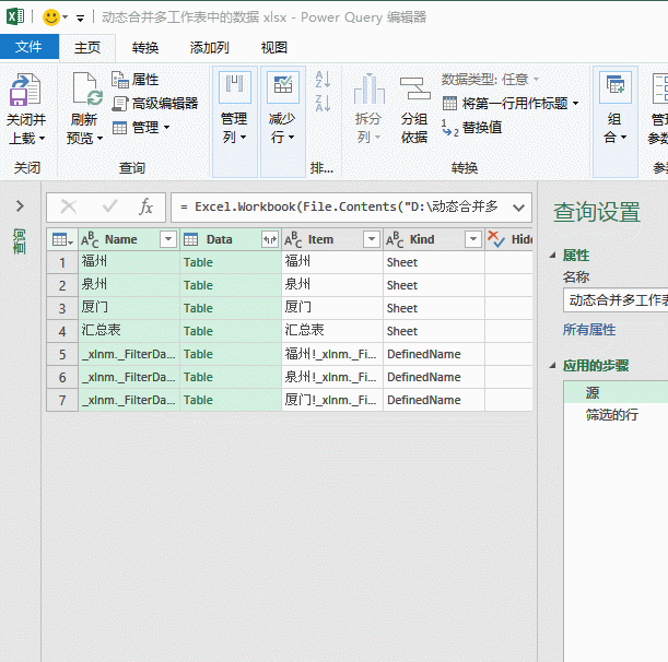在数据查询编辑器中,咱们需要把这些都筛选掉,单击【Kind】字段的筛选按钮,在筛选菜单中选择“Sheet”的类型。