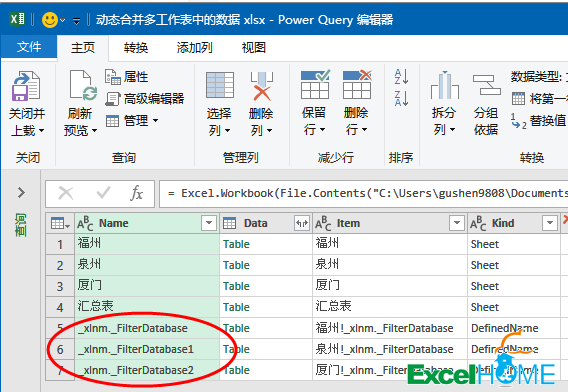 除此之外,还需要将在【Name】字段中,将“汇总表”也筛选掉,否则合并后你会发现数据会成倍增加,增加了很多重复的记录。